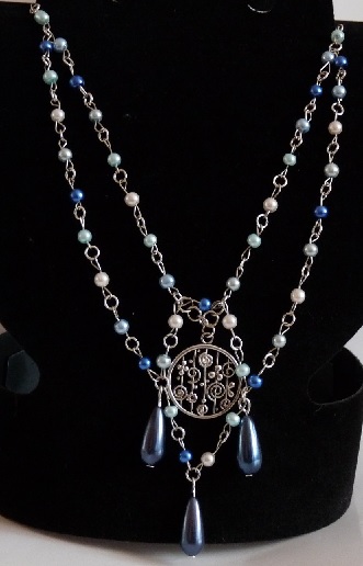 Materiál: bižuterní kov, skleněné voskované perličky, skleněné voskované kapičky, přívěsek z bižuterního kovu